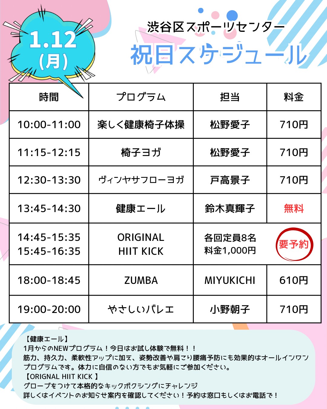 お子さまのためのキッズスクールと大人のためのスポーツ教室を実施しています! お子さま・大人の教室、合わせて週に70本以上開催! プールとスタジオでは人気のスイミングスクールからスタジオスクールなど大人からお子さままで多彩なレッスンを実施しております。定期教室なので、お好きなクラスをチョイスしてトライしていただけます! 大人教室は渋谷区以外の方も利用できるようになりました。大人スタジオレッスンなら、無料レッスンもございますので、まずは体験参加してみませんか。 最新タイムテーブルはこちらから 祝日特別レッスンも開催! 祝日には特別プログラムを実施しております!トップページ「お知らせ」にてご案内いたしますので、お見逃し無く。 また祝日スケジュールがある場合はスケジュール表をリンクしておりますので下記バナーからご覧ください!実施していない場合はリンクいたしませんのでご了承ください。 祝日の特別スケジュールはこち